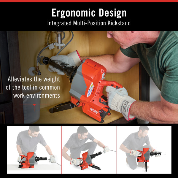 • Ergonomic – Integrated, multi-position kickstand alleviates the weight of the tool in common work environments, such as under cramped sinks and in tubs for improved comfort and support