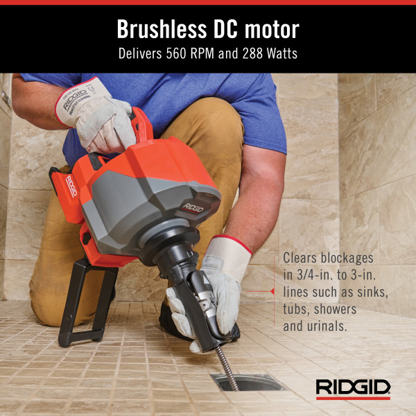 • Power – Features a Brushless DC motor that clears tough blockages in 3/4″ to 3″ (20 – 76 mm) lines such as sinks, tubs, showers and urinals