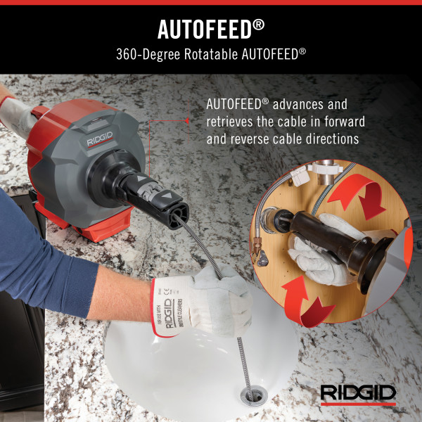 • AUTOFEED® – 360-degree rotatable AUTOFEED® advances and retrieves the cable in forward and reverse cable directions for improved pipe navigation such as tight bends and p-traps