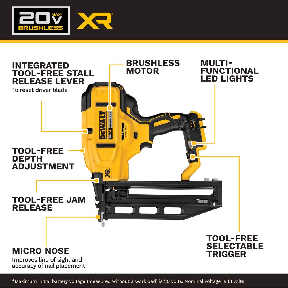 The DEWALT DCN662 20V MAX* XR 16 GA Cordless Straight Finish Nailer drives 16 Gauge straight finish nails from 1-1/4″ to 2-1/2″ which makes it ideal for fastening baseboards, door/window casing, and crown molding. With its brushless motor powered by a DEWALT 20V MAX* Lithium-Ion battery, the DCN662 is ready to go to work without the hassle of using gas, compressor, and hose. Tackle jobs both large and small with the features of a pneumatic tool and the freedom of cordless.