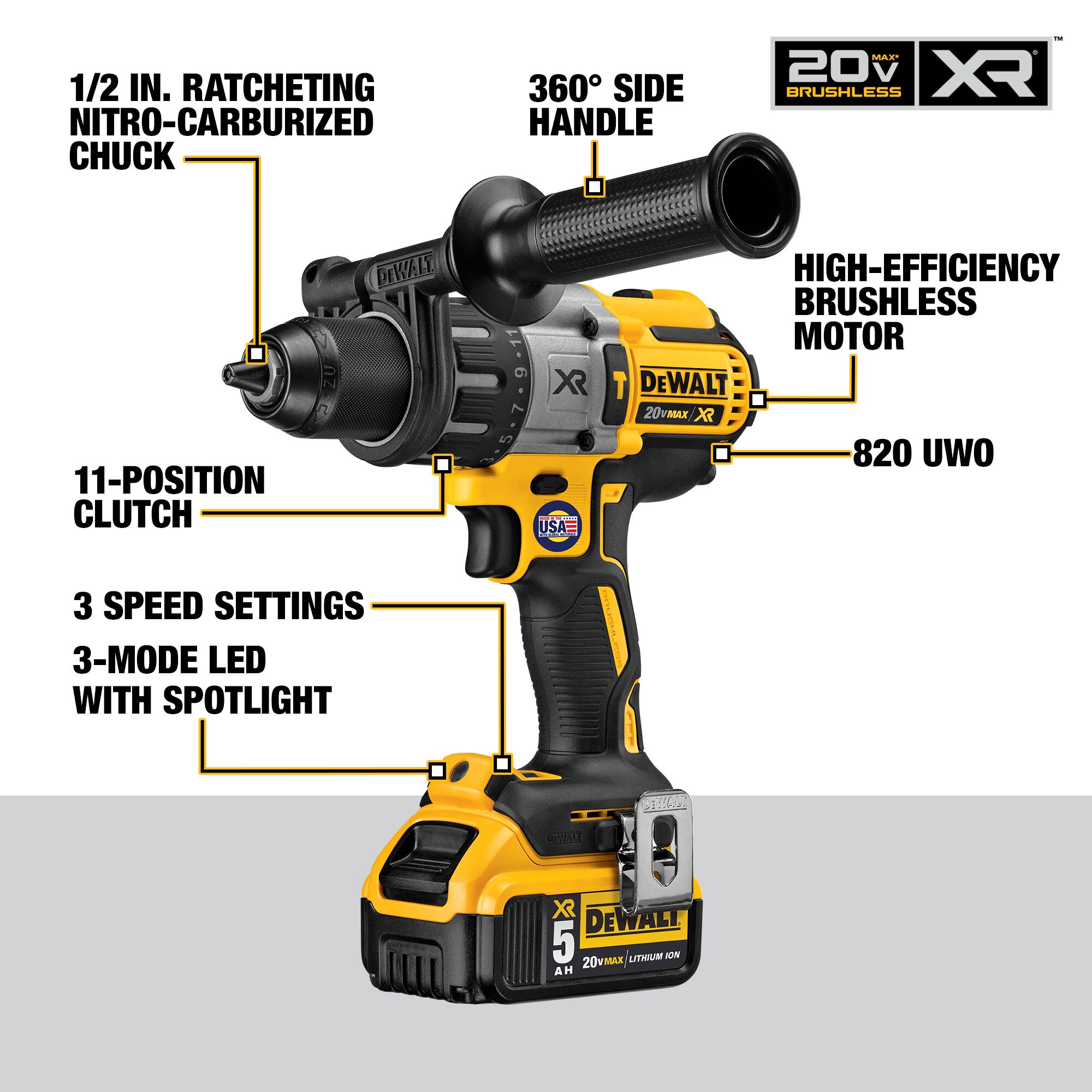 • DCD996 has a DEWALT-built high power high efficiency brushless motor that delivers more runtime vs. brushed motors. It also has a heavy-duty 1/2″ ratcheting nitro-carburized metal chuck with carbide inserts for superior bit gripping strength.