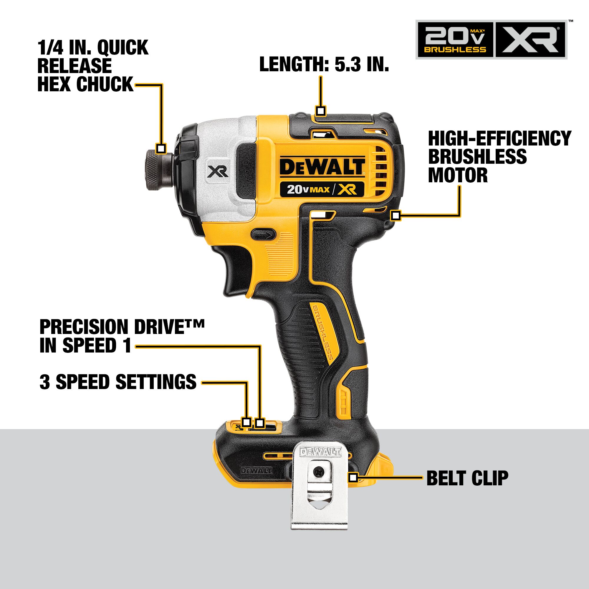 • DCF887 has a DEWALT built brushless motor for longer run time and has 3-speed settings for versatility with Precision Drive for added control