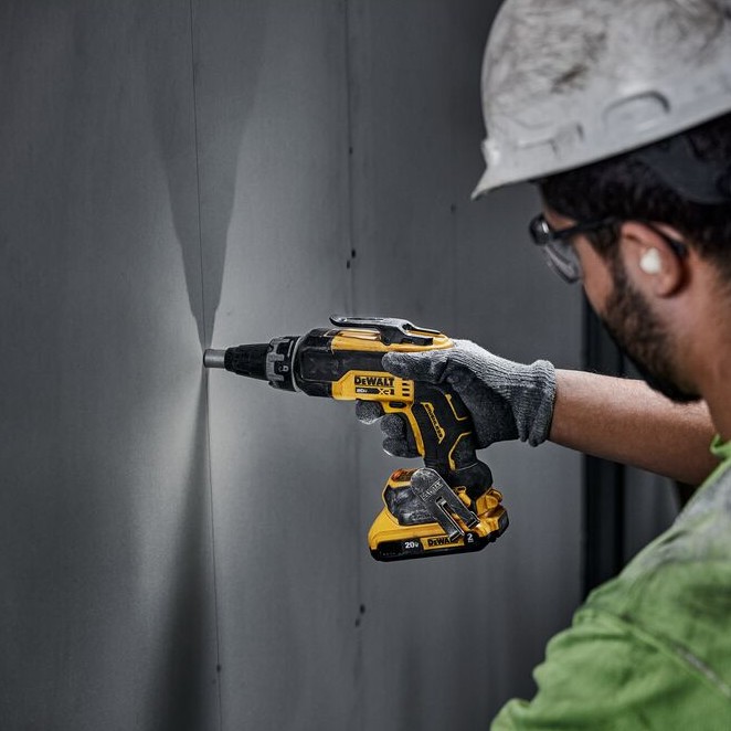 The DCE555 20V MAX* Drywall Cut-Out Tool features a 26,000 RPM brushless motor which helps enable fast and clean cutting on a variety of wall paneling. It’s compact and lightweight design makes it the most compact drywall cut-out tool in it’s class**. The DCF630 Brushless Drywall Screwgun features a brushless motor and electronic mode select to help optimize usage in a range of drywall hanging applications. The compact size and weight are designed to reduce fatigue during periods of extended usage, while its wide upper grip flange enables secure placement of thumb and forefinger. The 20V MAX* Compact Lithium Ion Battery Pack has an extended runtime battery and provides immediate feedback on state of charge with the 3-LED Fuel Gauge System.