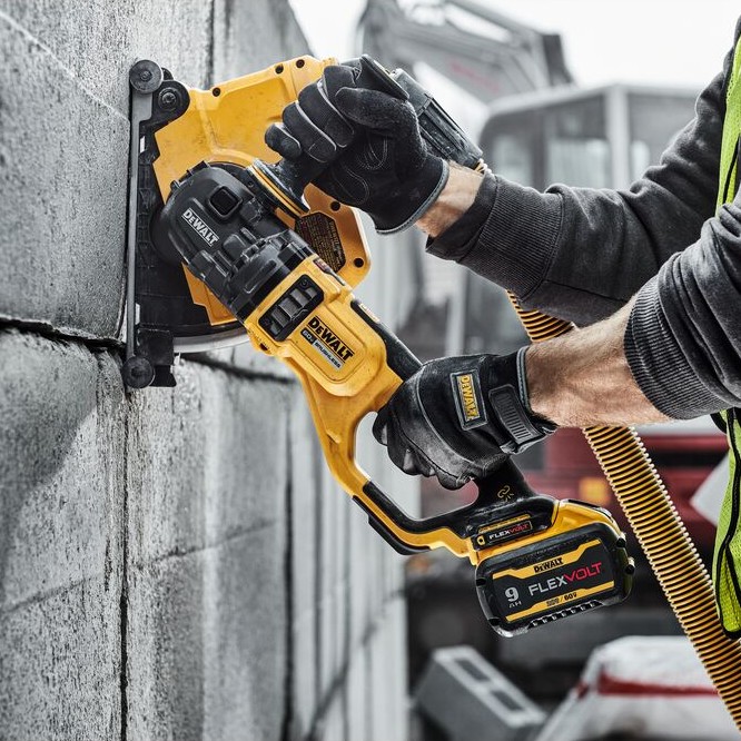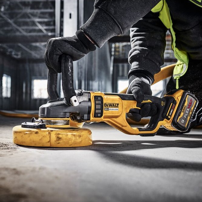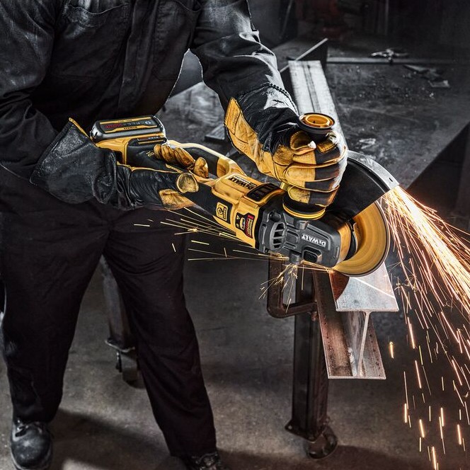 The 60V MAX* 7-9 in. Large Angle Grinder, DEWALT’s first cordless Large Angle Grinder, delivers immense power at more than 3,000 MWO with a brushless motor. Built with user protection top of mind, a Kickback Brake brings the wheel to a halt for full stoppage when a kickback is detected, while the E-CLUTCH® System immediately shuts down the motor when a pinch or stall is sensed. In addition, the Grinder is equipped with a No-Volt switch that prevents the tool from restarting following a loss of power.