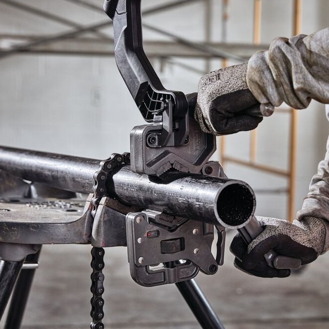 The FLEXVOLT® 60V MAX* Pipe Threader can thread ½ in. – 2 in. black iron pipe, rigid conduit, and more. It comes with an oil-resistant glass-filled nylon battery to protect it from cutting oils used to complete threads and is housed in a latched and sealed battery box. Equipped with the E-Clutch® System, that senses the motion of the tool and shuts down if necessary in bind-up situations. This kit also includes a patent pending pipe clamp with a depth gauge, for quick set up, and a die arm that can be used to start the threads without direct contact to the spinning die head. This tool is Tool Connect™ Tag-Ready™ (Tool Connect Tag sold separately). The DCE700 Pipe Threader is also compatible with RIDGID® 12R** style die heads.