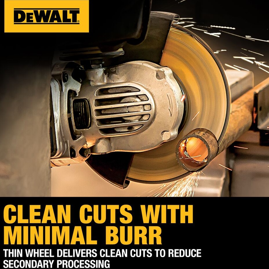 With a thin .045″ wheel design for quick, burr-free cuts, DEWALT Type 27 XP Metal Cutting Wheels feature a specially treated grain combination for aggressive cutting action. 2 full sheets of fiberglass ensure durability and safety. A proprietary material mix extends wheel life.