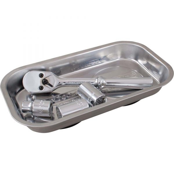 Keep your workspace organized and your small parts secure with the Gray Tools Stainless Steel Magnetic Tray. Measuring 9-1/2″ x 1-1/2″ x 5-1/2″, this durable tray features a strong magnet that firmly holds bolts, nuts, sockets, and other small components, even when mounted vertically or upside down. The nonmarring rubber base protects surfaces from scratches while maintaining a solid grip on any steel surface. Perfect for mechanics and technicians, it’s a smart solution for keeping hardware within reach during any project.
