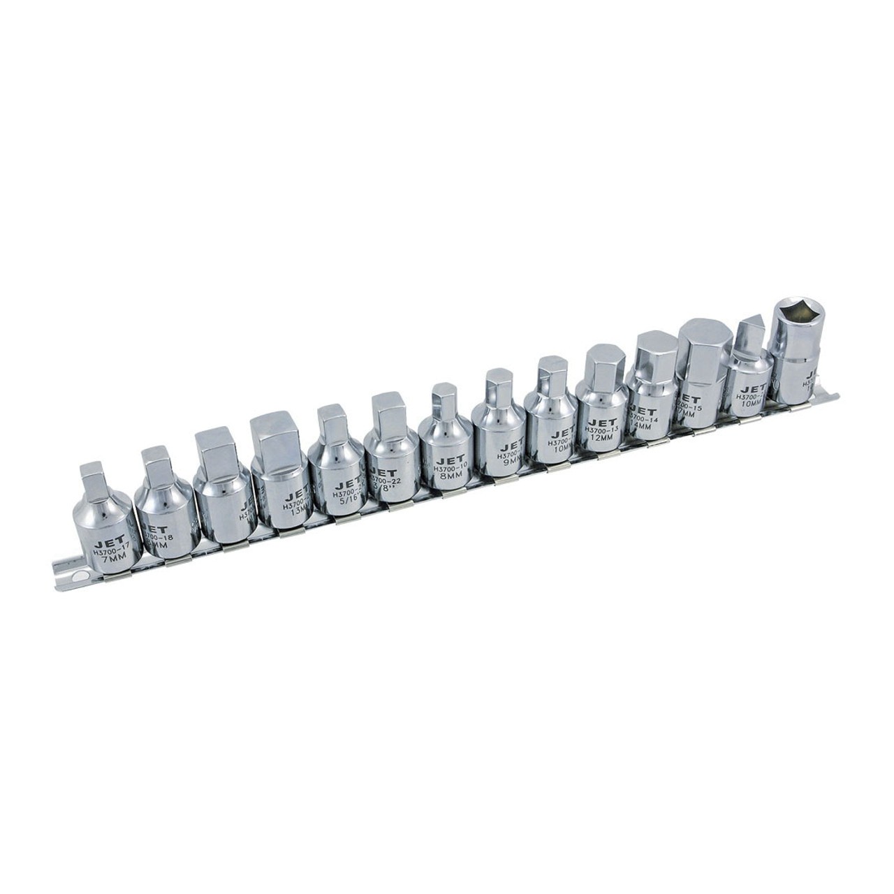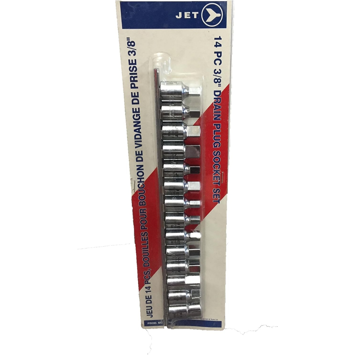 The JET H3700 14-Piece Oil Drain Plug Socket Set is designed to tackle oil drain plugs on most domestic, European, and Asian vehicles with precision and ease. Built from durable chrome vanadium steel and finished with a bright polish, these sockets resist corrosion and ensure lasting strength for professional use. Ideal for oil change specialists and service shops, the set includes a complete range of hex, square, and triangle sockets to handle nearly any drain plug configuration. Each socket is conveniently stored on a sturdy metal clip rail for organized access and portability.
