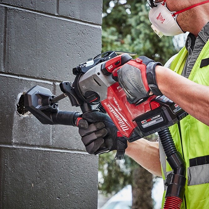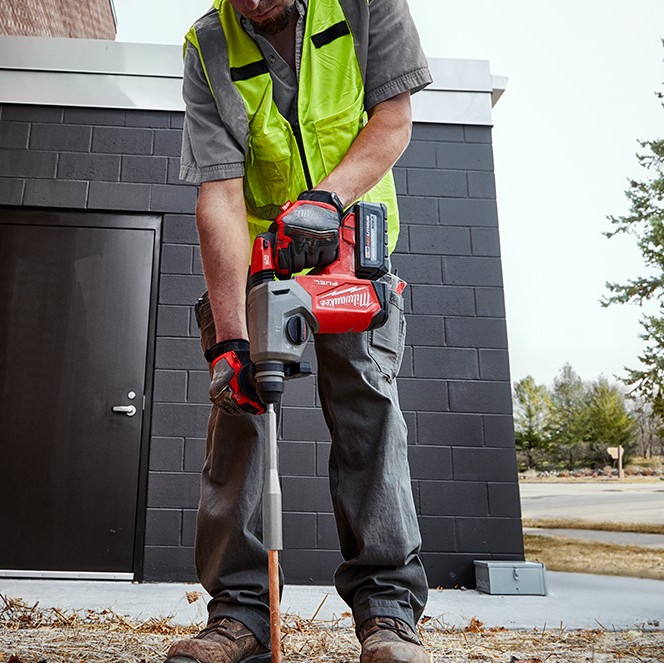 Our M18 FUEL 1″ SDS Plus Rotary Hammer Kit is the next generation of cordless rotary hammers delivering ultimate jobsite performance and productivity. The MILWAUKEE® M18 FUEL™ 1″ SDS Plus Rotary Hammer is the fastest drilling rotary hammer in its class, includes AUTOSTOP™ Control for enhanced safety, and can drill up to (125) 3/8 in. x 2 in. holes per charge when paired with the M18™ HIGH OUTPUT™ XC6.0 Battery. The POWERSTATE™ Brushless Motor delivers you 2 ft-lbs of impact energy, 1,330 RPM, and 4,800 BPM, providing speed and power in the most demanding applications. REDLINK PLUS™ intelligence tool technology ensures maximum rotary drill performance and protects it from overload, overheating, and over-discharge. The M18™ REDLITHIUM™ HIGH OUTPUT™ XC6.0 Battery delivers 50% more power while running 50% cooler than the M18™ REDLITHIUM™ XC batteries. This hammer provides maximum control and enhanced safety with the AUTOSTOP™ Kickback Control. This feature prevents over-rotation if the tool gets bound up while you’re drilling in rebar or hard aggregate. Milwaukee’s AVS Anti-Vibration System minimizes vibration for maximum comfort.