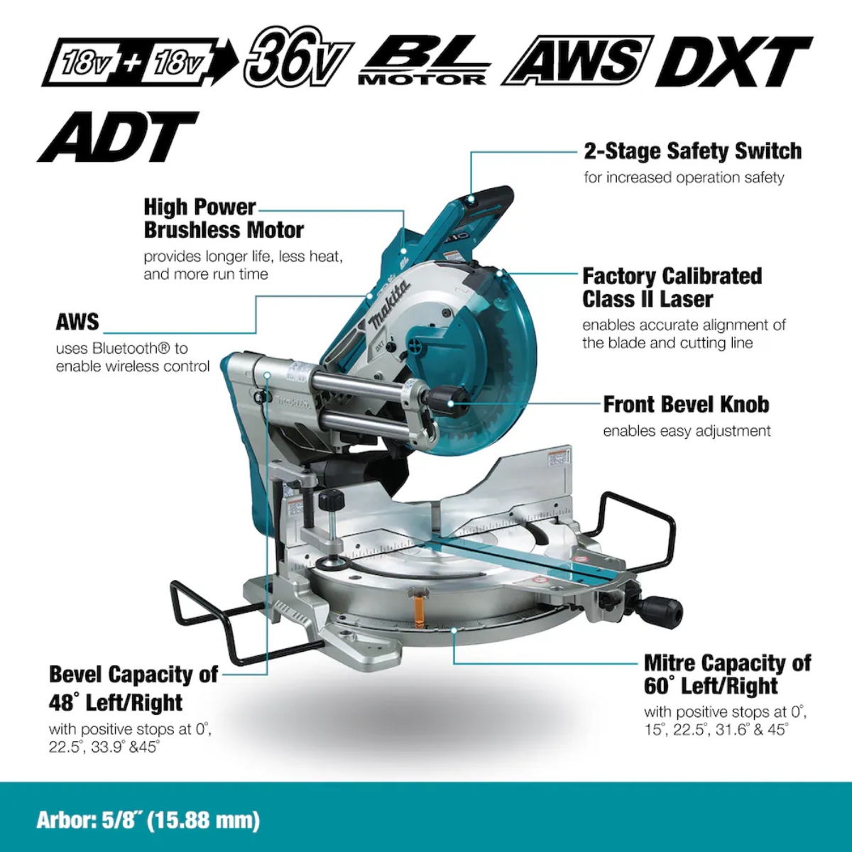 The Makita 36V (18Vx2) LXT Brushless 10″ Slide Compound Miter Saw delivers precision, power, and cordless versatility. Featuring Auto-Start Wireless System (AWS) technology, it enables wireless dust collection by communicating with compatible vacuums via Bluetooth®. Deep and Exact Cutting Technology (DXT) provides up to 12″ cuts in 2x material, 6-5/8″ nested crown molding, and 5-1/4″ vertical baseboard. Automatic Torque Drive Technology (ADT) optimizes speed and torque based on load conditions, while the rail-forward design allows for wall placement to maximize workspace. Additional features include a front bevel adjustment knob, electric brake, soft start, factory-calibrated laser, and LED charge level indicator. With a bevel capacity of 48° left/right and miter capacity of 60° left/right, this saw is built for precision and efficiency in any cutting application.