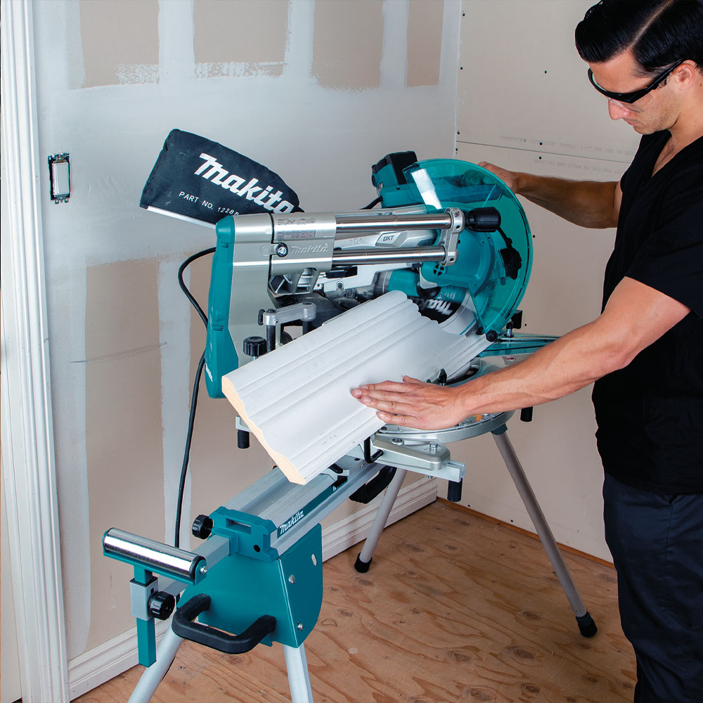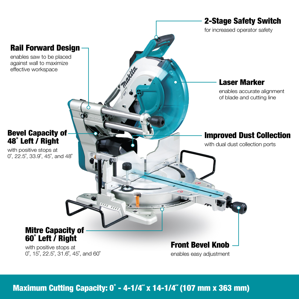 The Makita 12″ Sliding Compound Miter Saw with Laser delivers exceptional cutting capacity and precision, handling 15″ crosscuts in 2x material, 8″ nested crown molding, and 6-3/4″ vertical baseboards with ease. Makita’s Deep and eXact Cutting Technology (DXT) ensures smooth, accurate cuts, while the zero-clearance rail forward design maximizes workspace efficiency by allowing placement against a wall. The integrated guide fence system enhances rigidity and material support, and the front bevel knob enables easy adjustments without reaching behind the saw. Features like constant speed control, soft start, an electric brake, and a laser marker provide precision, safety, and smooth operation. With a 60° mitre range, 48° bevel range, dual dust collection ports, and an ergonomic soft rubber grip, this saw is built for professional performance and operator comfort.