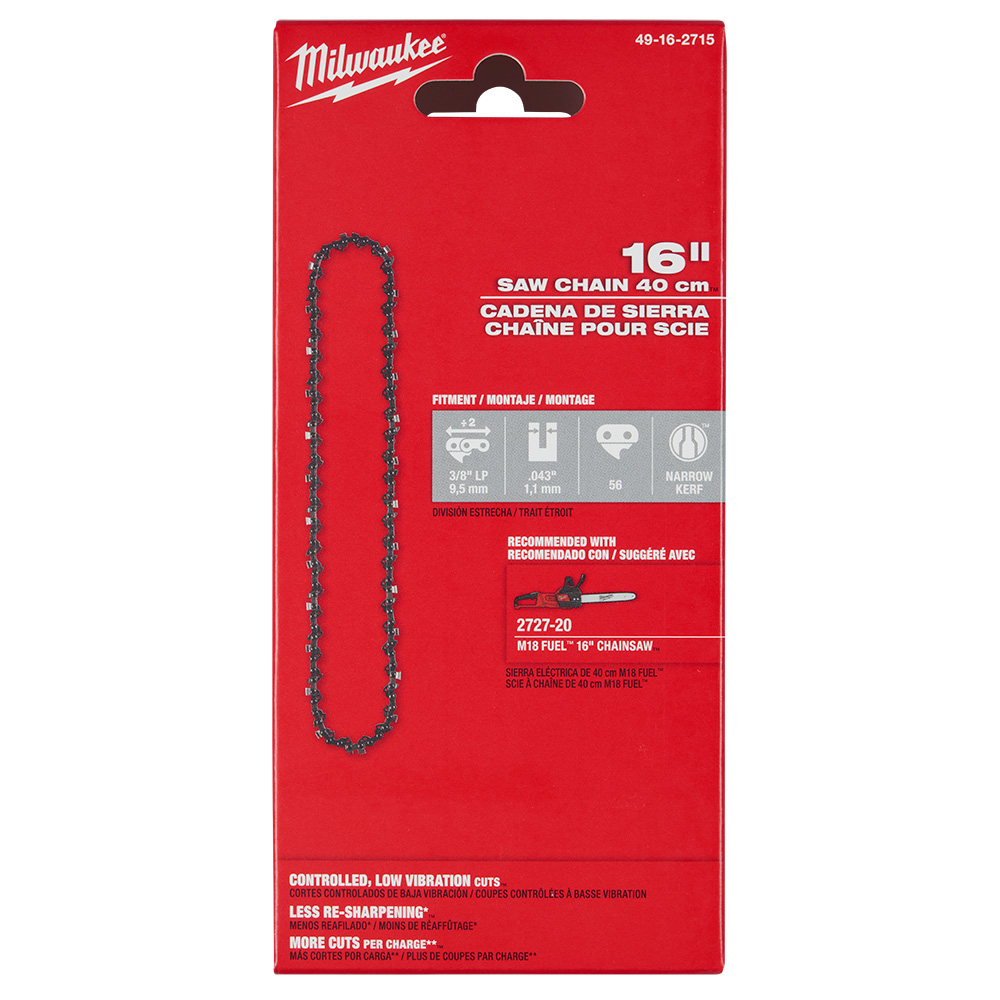 Our 16″ 3/8″ LOW PROFILE™ Pitch, .043″ Gauge Saw Chain is designed to provide controlled, low-vibration cuts. The chamfer chisel tooth shape means less re-sharpening vs a full-chisel cutter. The narrow kerf, LOW PROFILE™ cutters offer more cuts per charge versus standard kerf to help maximize battery efficiency. This chain is recommended for use with our M18 FUEL™ 16″ Chainsaw (2727-20) and 16″ 3/8″ LOW PROFILE™ Pitch, .043″ Gauge Guide Bar (48-09-3001) and fits chainsaws & narrow kerf bars of the same pitch, gauge, length, and drive links.
