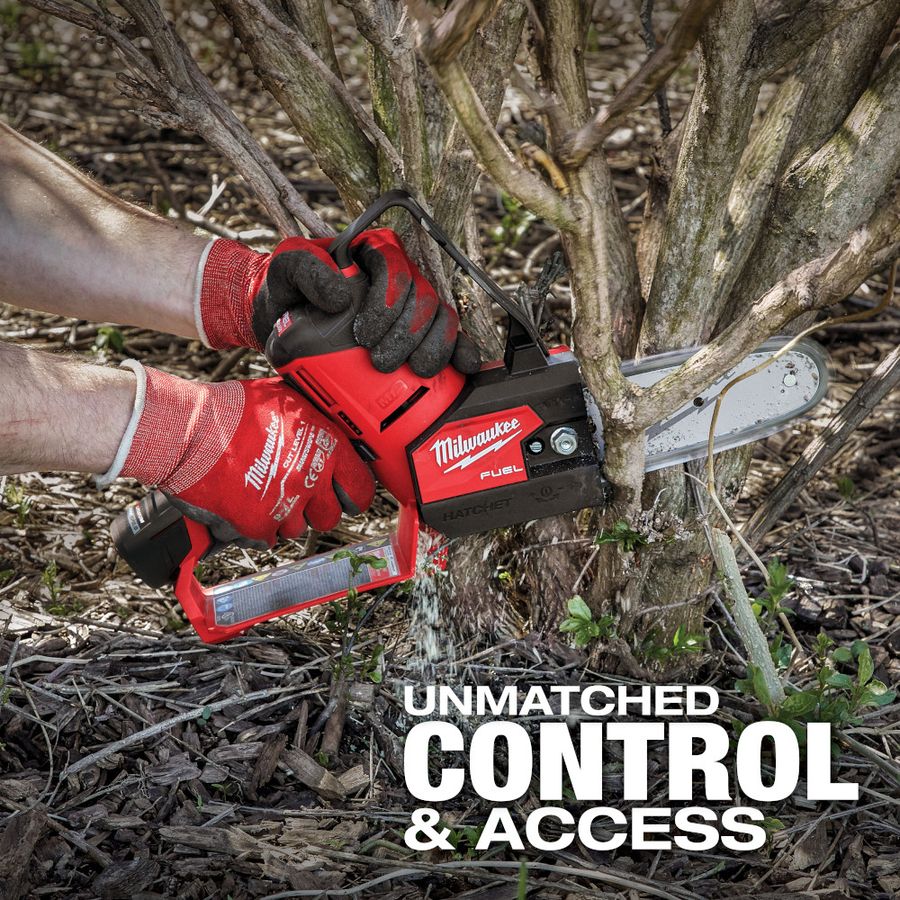 Our M12 FUEL™ HATCHET™ 6″ Pruning Saw Kit delivers unmatched control & access, has the power to cut 3″ hardwoods, and delivers up to 120 cuts per charge. This electric pruning saw is designed to meet the ergonomic, performance, and durability needs of landscape maintenance professionals. Weighing less than 5 lbs and featuring a compact design, the cordless pruning saw gives you increased control and maneuverability in tight access areas. The POWERSTATE™ Brushless Motor delivers the power to complete cuts in demanding hardwood materials. The REDLINK PLUS™ Intelligence enables full-circle communication between the tool and battery, providing you with unmatched levels of performance, protection, and productivity. The advanced electronic package also delivers an instant throttle response and a variable speed trigger for ultimate control over the power range. The M12™ REDLITHIUM™ XC 4.0Ah Battery delivers best in class run-time and performance. This pruning saw features a full house chain, easy access chain tensioner, automatic oiler, metal bucking spikes, and onboard storage for the scrench. The MILWAUKEE® M12 FUEL™ HATCHET™ 6″ Pruning Saw is part of the M12™ System which is fully compatible with over 100 solutions.