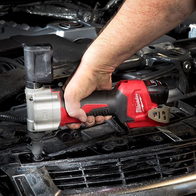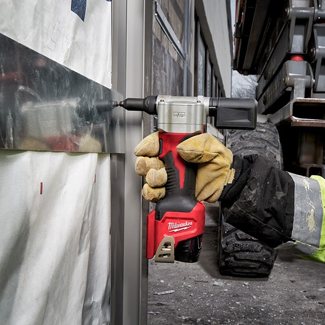 The M12™ Rivet Tool is the first cordless solution that delivers fast, easy riveting while maintaining performance, durability, and size. The 2550 can pull up to 250 3/16″ stainless steel rivets or 450 1/8″ steel rivets on one charge with a 1.5ah battery, and reduces muscle effort from a hand tool by 60%. No compressors or hoses during set up and operation makes this tool a great replacement to pneumatic products. 2X longer life over current cordless solutions delivers greater durability from common jobsite conditions and use. This is the most compact cordless rivet tool on the market, measuring only 6.5” in length allowing users more access in tight spaces. The M12 Rivet Tool is part of the M12 battery platform, offering 90+ solutions on one battery system.