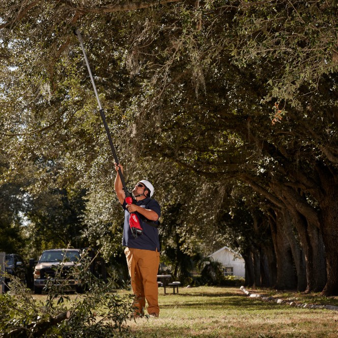 Our M18™ Brushless Telescoping Pole Pruning Shears provides users with fast clean pruning and eliminate the frustrations of pulling a manual pole pruner. These telescoping pole pruning shears allow users to make clean, precise bypass pruning cuts in branches up to 1-3/4” with minimal effort, while being able to easily telescope from 7ft. to reach a maximum length of 10ft. When paired with our M18™ REDLITHIUM™ HIGH OUTPUT™ XC6.0 Battery Pack these telescoping pole pruning shears can complete pruning applications up to 3X faster compared to standard manual pole pruners. Our M18™ Brushless Telescoping Pole Pruning Shears is fully compatible with 250+ solutions in the M18™ system.