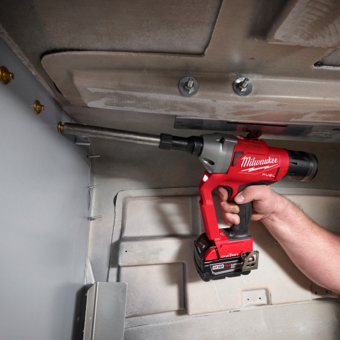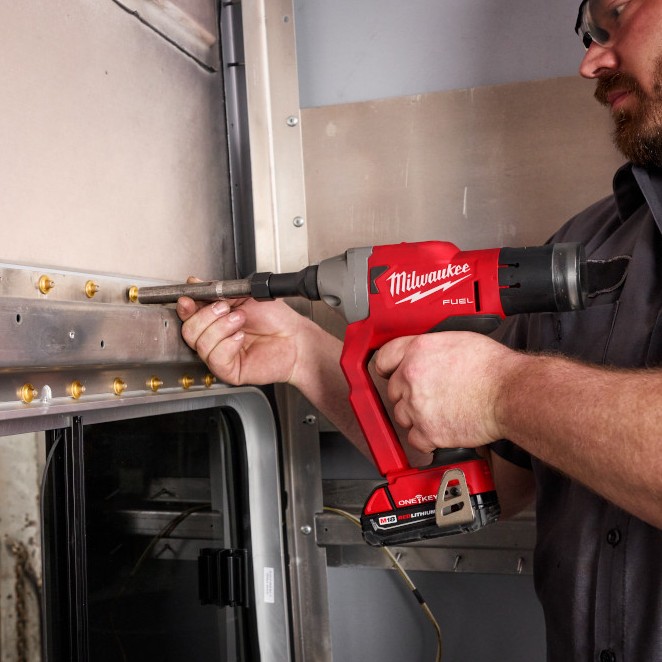 Our M18 FUEL™ ¼” Lockbolt Tool w/ ONE-KEY™ is the fastest lockbolt tool in the market. It eliminates the need for hoses and compressors while delivering up to 2X the speed of application compared to other cordless lockbolt tools. This solution will install up to 1,200 1-1/4” Aluminum Magna Grip Lockbolts on a single charge of the M18™ REDLITHIUM™ XC5.0Ah battery (not included). The POWERSTATE™ Brushless Motor delivers 4,500 lbs. (20kN) of pulling force to install Magna-Grip, C6L, C120L, Bobtail, Hucktainer Lockbolts (with Adapter) and 3/16″ through 9/32″ Blind Rivets (with purchase of M18 1/4″ Lockbolt to Blind Rivet Tool Conversion Kit), installing the widest range of riveting fasteners in the market. While lightweight, the Milwaukee Lockbolt Tool was designed to withstand harsh shop or assembly plant environments, manufactured with an all-metal gearcase, impact strength plastics, and protective over-mold. M18™ REDLITHIUM™ Battery Packs fit all M18™ tools, providing you with more work per charge and more work over the battery life. REDLINK PLUS™ Intelligence ensures maximum performance and protects the Lockbolt tool and battery against overloads, over-heating, and over-discharge. The MILWAUKEE® M18 FUEL™ ¼” Lockbolt Tool has ONE-KEY™ compatibility, allowing you to track and manage your tool.