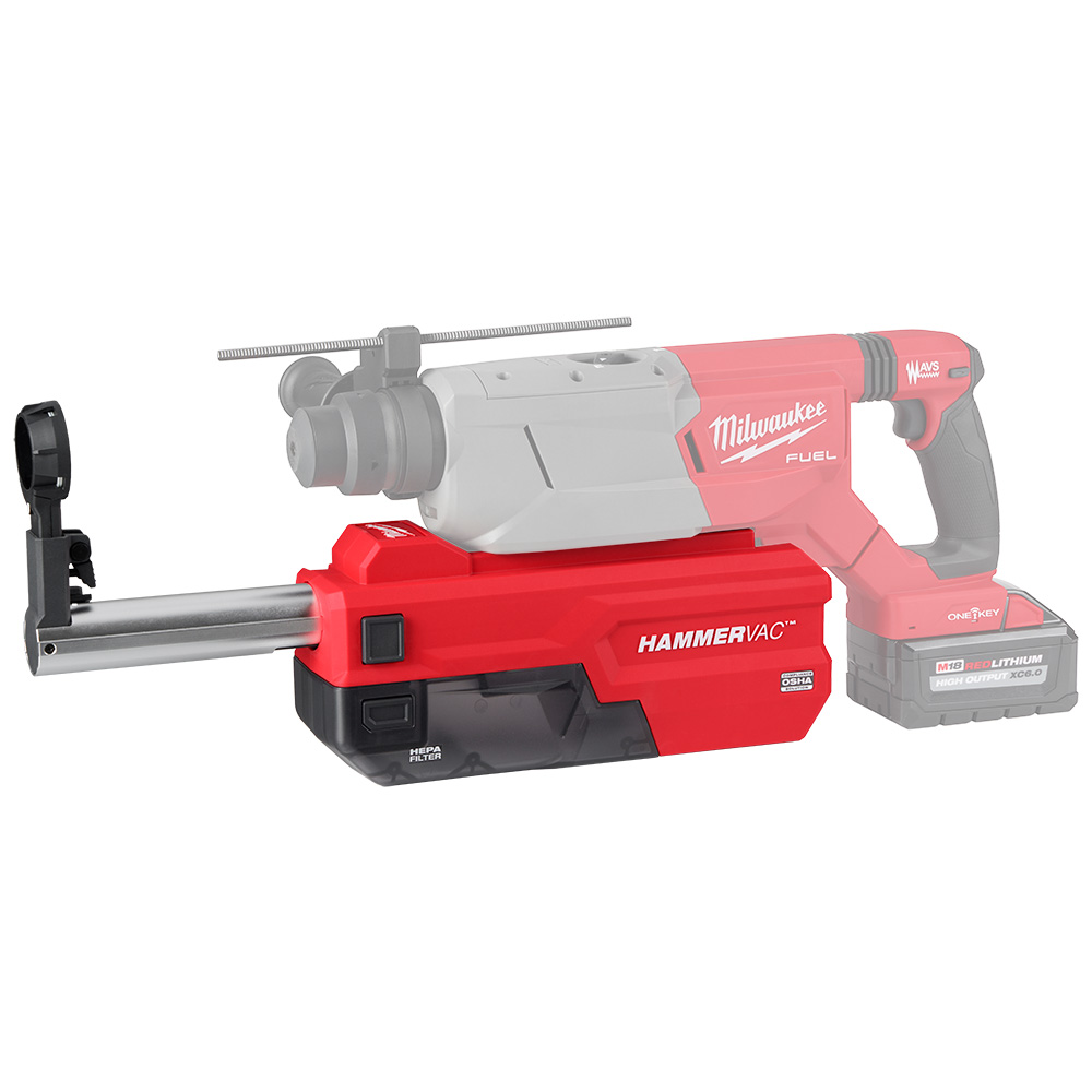 Our HAMMERVAC™ 1-1/4” Dedicated Dust Extractor features an inline design engineered to connect directly to and be powered by our MILWAUKEE® M18 FUEL™ 1-1/4” SDS Plus D-Handle Rotary Hammer w/ ONE-KEY™. Utilizing the same replaceable certified HEPA filter as other HAMMERVACS™, which filters 99.97% of all particles greater than 0.3µm, means more compatibility on the jobsite. The built-in adjustable depth stop and ruler offer easy and precise adjustments. Our dust extractor allows full OSHA Table One Compliance when drilling up to 1-1/4” in diameter and 8” in depth. This extractor features our AUTOPULSE™ Filter Cleaning Mechanism that automatically cleans the filter after each use, ensuring our users are able to drill more effectively and for longer before needing to empty the dust box. The dust box comes equipped with a vacuum port that allows our users to suction out the dust with a large vacuum or dust extractor instead of dumping the dust out into a trash receptacle, ensuring minimal exposure.