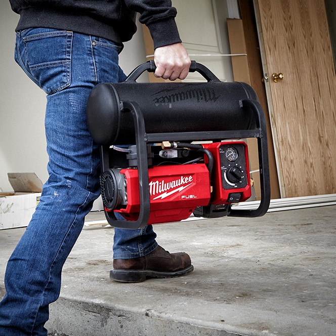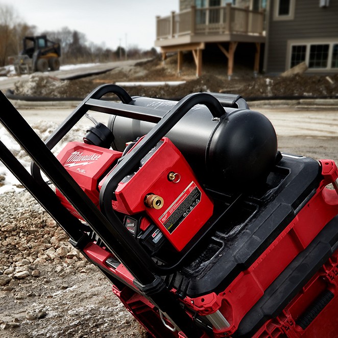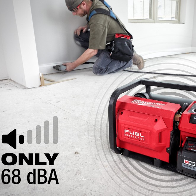 Our M18 FUEL™ 2 Gallon Compact Quiet Compressor is designed for the professional carpenter and remodeler. This quiet air compressor is only 68dB(A), making it the quietest cordless compressor on the market and quieter than most corded options. Milwaukee has designed this 2-gallon air compressor to be high performing while reducing the noise professionals deal with on jobsites. Its low profile and stackable design allow our portable air compressor to be easily stored and transported on, around, and back off the jobsite. It has run-time professionals need to stay productive, giving you up to 1,600 18ga brad nails per charge. It is compatible with all MILWAUKEE® M18™ REDLITHIUM™ batteries making it easy to swap packs and keep running to finish your job. Battery and charger sold separately.