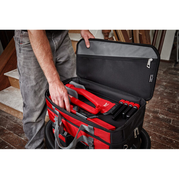 This Vacuum Tool Storage Bag provides a durable and versatile storage solution for vacuum tools that attach to the top of select Milwaukee Wet/Dry Vacuums. The top storage area is optimized for longer vacuum tools and has an enclosed zipper area for smaller pieces. Bottom storage can be customizable with adjustable velcro inserts to fit a variety of vacuum tools. The durable mounting hooks easily latch to the motor heads of select MILWAUKEE® Wet/Dry Vacuums (0910, 0920, 0930), making transporting these tools and vacuum accessories to the jobsite easier. You can compactly store these hooks on the bag by lifting them under the dedicated loops. Tear-resistant 1680D ballistic material and all-metal hardware ensure the Vacuum Tool Storage Bag is built to withstand harsh jobsite conditions. Vacuum attachments sold separately.