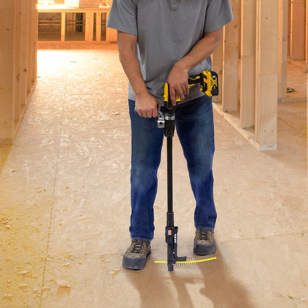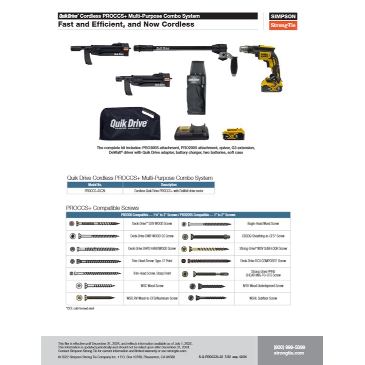 The cordless Quik Drive PROCCS+ Multi-Purpose Combo System is a complete auto-feed screw driving system with two Quik Drive attachments (the PRO200SG2 and PRO300SG2) that provide tools for installing decks, subfloor, sheathing and underlayment. The powerful 2,000 rpm, 20V cordless DeWALT® brushless driver motor and lightweight extension make this Quik Drive system more ergonomic than conventional installation systems: no cords to trip over, no heavy equipment to set up, and more freedom to move about the work area untethered.